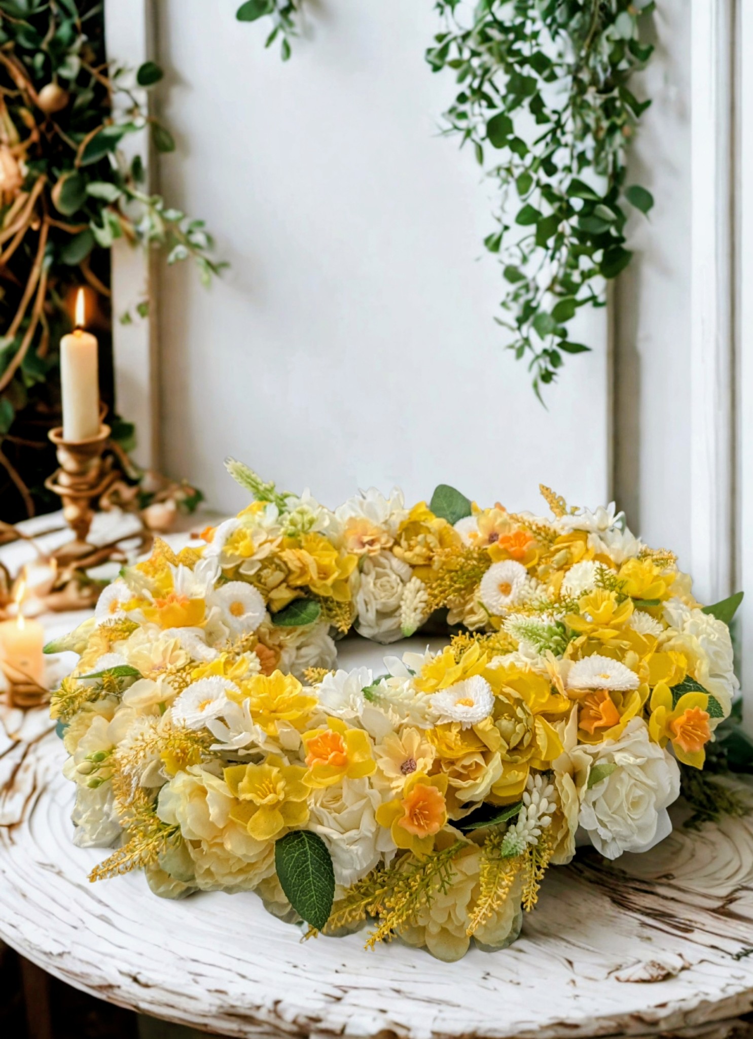40 cm átmérőjű, vessző koszorú alapra készült.